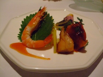 前菜盛り合わせ。蒸しエビ、チャーシュー、くらげの冷製、ピータン豆腐。