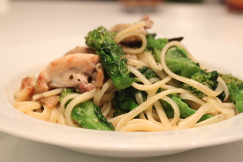 鶏もも肉1/3枚、菜の花1/3束、リングイネ100g、にんにく1片、赤唐辛子1本、オリーブオイル、クレイジーソルト