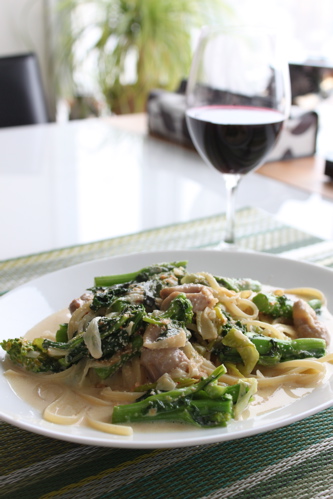 菜の花1/3束、鶏もも肉1/3枚、明太子1腹、ねぎ1/3本、生クリーム1/3パック、にんにく1片、塩こしょう、オリーブオイル、リングイネ100g