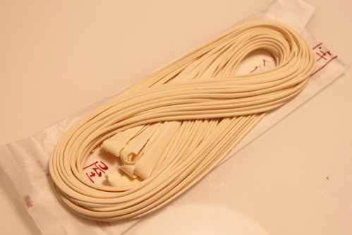 袋をあけると麺が8の字になっていて、8の字の上下を切ってゆでると書いてありました。上下2カ所を切ると麺はS字になりました。ゆで時間は15分だったかな。長めでした。