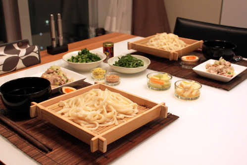 この日は用事があってデパートに行ったので、ついでに地下でうどんとつゆ、そしてお惣菜や漬け物を買ってきたので、ちゃちゃっとできあがりました。