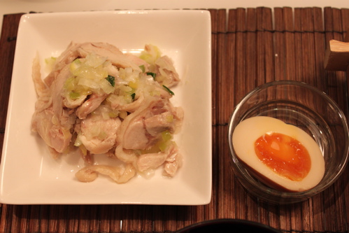 おかずはデパ地下のデリで買った鶏肉のねぎ塩和え、彼がつくってくれた味玉です。