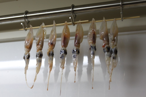 生のホタルイカを洗って串に刺して干すだけ。簡単、簡単♪