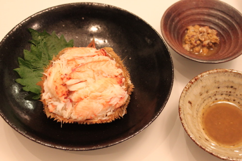 ゆでた毛蟹を1パイいただいたので、さばいて甲羅に身をつめて、カニ味噌は小さな器に。味噌が溶けたゆで汁が甲羅の中にあったので、蟹の身をつけていただくためにこちらも小さな器に入れて出しました。