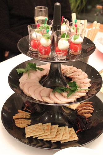 3段トレーには上からプチカプレーゼ、自家製鶏ハム、ドライフルーツとクラッカーを並べました。