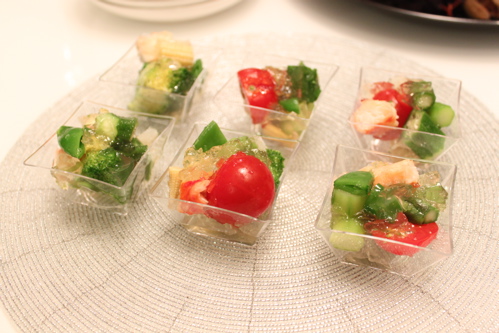 野菜のゼリー寄せは切ったらくずれたのでカップにいれてだしました。
