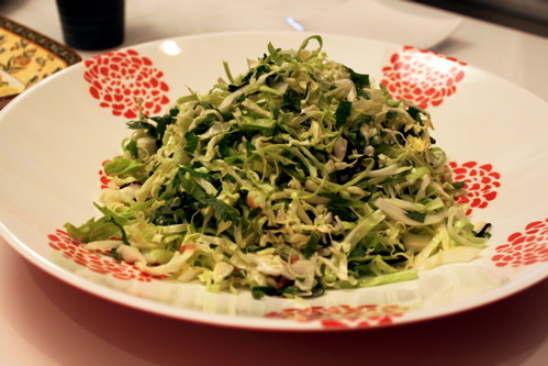 せんぎりキャベツ、大葉のせんぎり、塩こんぶ、梅干しをたたいたものをざっくり合えました。さっぱりしているのですが、意外と白ワインなどにも合います。