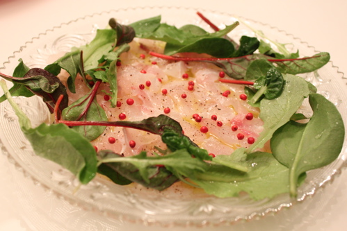 これは事前に作って冷蔵庫で冷やしておいた鯛のカルパッチョ。