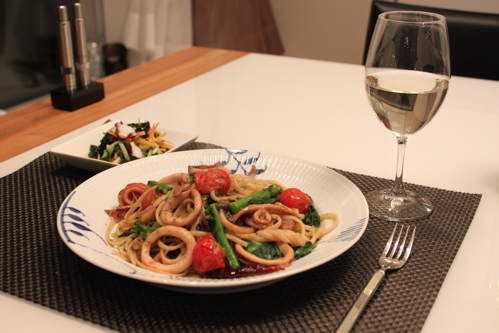 今回は「いかのわた焼き」用に買った真イカ、裏メニューとして「菜の花のおひたし」もしくは「菜の花のアーリオ・オーリオ」用に買ってあった菜の花を使ってパスタを作りました。