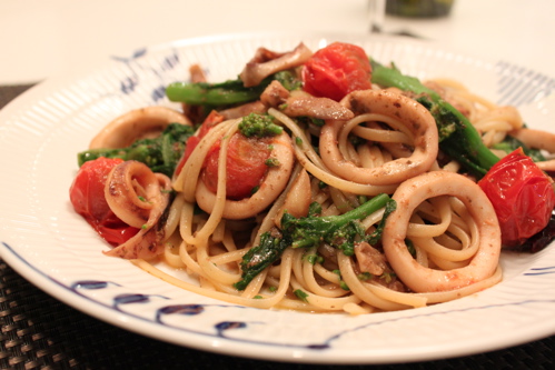 真イカ1パイ、菜の花2/3束、ミニトマト12個、リングイネ200g、にんにく2片、赤唐辛子2本、塩、オリーブオイル