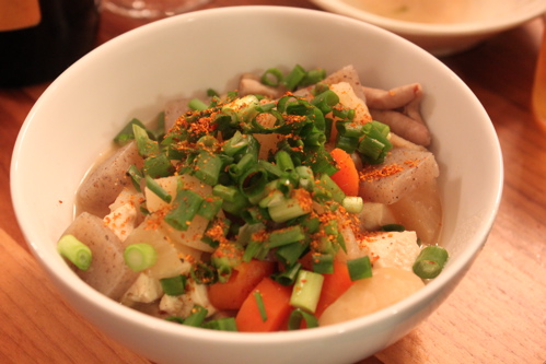 入っているのは豚の白もつ、大根、にんじん、ごぼう、こんにゃく、豆腐、ねぎ。