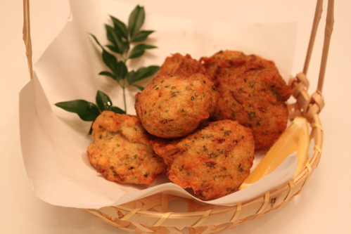 すりおろした山芋とれんこん、紅生姜、青のり、酒をまぜてスプーンでまとめて、サラダ油で揚げるだけ。簡単なのに、外はサクサクのカリカリ、中がふわふわのなんとも美味しい食感の揚げ物になるのです。レモンをギュッとしぼって召し上がれ。