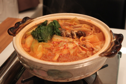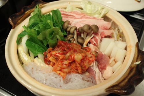 土鍋に市販のキムチ鍋スープを入れて、キャベツ、もやし、ねぎ、しめじ、大根、鶏もも肉、糸こんにゃく、ほうれん草、豚バラ肉、白菜キムチを入れて火にかけるだけ。