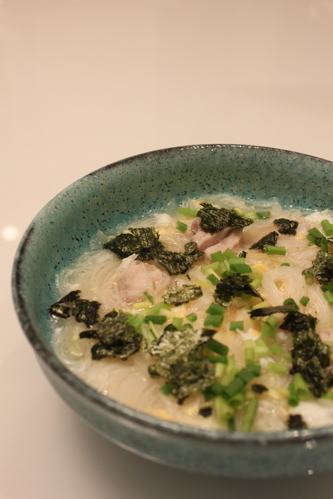 私はわが家のにゅうめんの基本、たまねぎと鶏肉ははずせなかったので、その2つで出汁をとり、そこへ素麺を投入、最後に味をみて顆粒のかつおだしを追加、溶き卵を加えて、器に盛ったところでちぎった海苔、こねぎを散らしました。塩気が足りなければ塩を加えてもいいと思います。