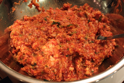 1)刻んだキムチと豚ひき肉をボウルに入れ粘り気がでるまでよく混ぜ合わせる。
