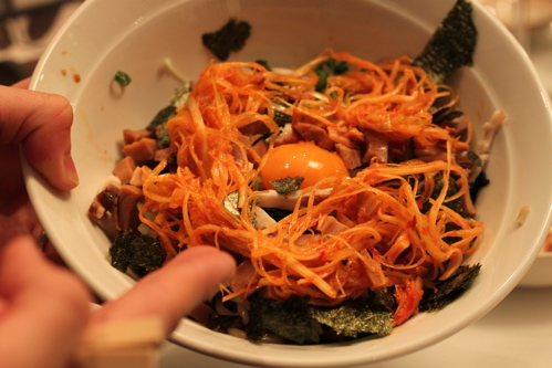 ビールを飲んで、彼はすき焼き(フライパンで作った簡単なもの)を少し食べ、買ってきた海鮮巻を少しだけいただきました。