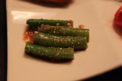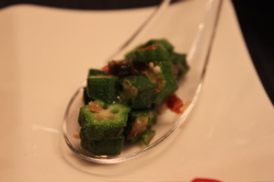 左上:えびとねぎの春巻き、右上:オクラ、左下:いんげんのごま和え、右下:トマトのジュレがけ。