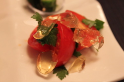 ジュレは先日のゼリー寄せを作った時に余ったコンソメジュレをスプーンでこまかくしてミニトマトとイタリアンパセリにかけたもの。