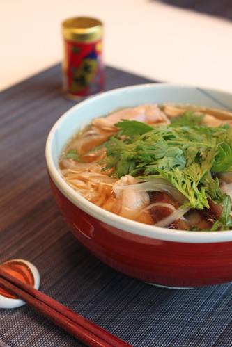 4)別の鍋で茹でた素麺を加えて全体をひとまぜしたら器に盛り、春菊をのせてできあがり♪お好みで七味唐辛子をかけて召し上がれ。