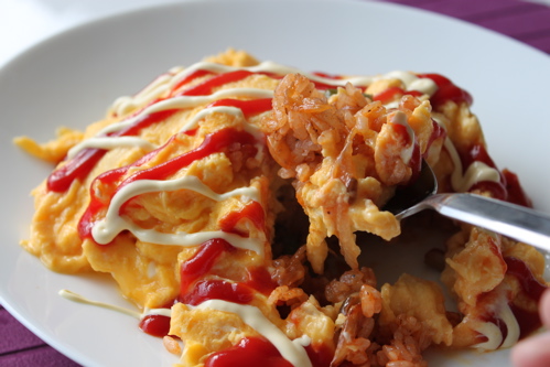 4)別のフライパンにバターを溶かし、牛乳を加えた溶き卵を中火で焼く。途中かき混ぜながら焼き、少しだけかたちをまとめ、液状の部分がなくなりかける頃火からおろして3)のごはんにのせる。ケチャップをかけてできあがり♪