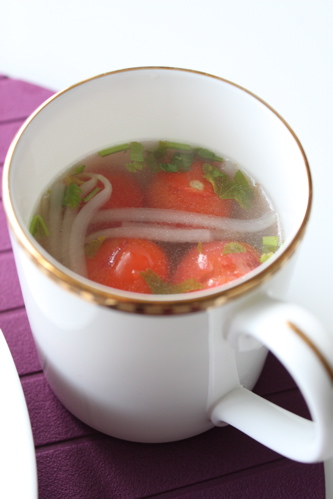 オムライスに添えたのはトマト入りスープ。