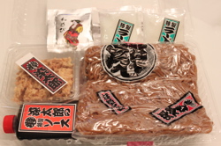 空けてみると(右)、茶色い麺、ソース、天かす、ラード、わさびふりかけが入っていました。
