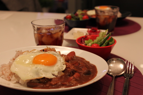 市販のカレールーの他にガラムマサラ、クミン、ナツメグなどのスパイスを使って仕上げ、ごはんは十六雑穀米、わが家の定番目玉焼きをトッピングしてできあがり♪