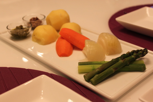 蒸した野菜はじゃがいも、にんじん、たまねぎ、アスパラガス。