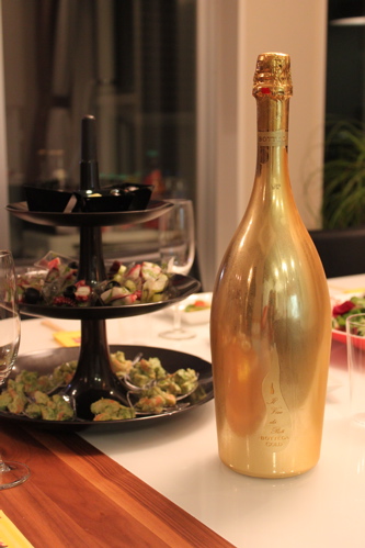乾杯はクリスマスにふさわしいゴージャスなボトルのスパークリングワインで。