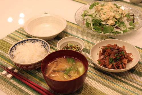 他にはもずくときゅうりの酢の物、えのきとねぎのお味噌汁、低カロご飯でヘルシー晩ごはん。