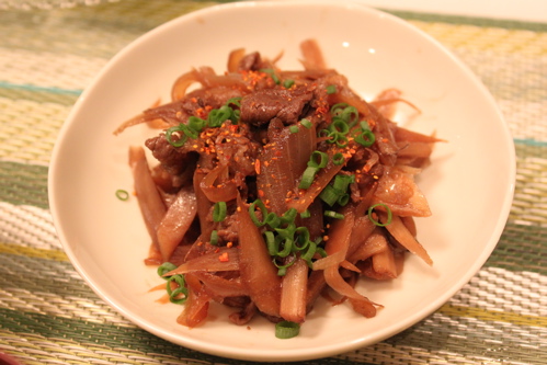 こちらは牛肉とごぼう、たまねぎを炒め煮して、酒、しょうゆ、砂糖で味付けしたもの。お皿にもってからこねぎと七味唐辛子をかけました。ごはんがすすむおかずです。牛肉はほんの少ししか使っていませんが、ごぼうとたまねぎのおかげでしっかり食べた感じがします。