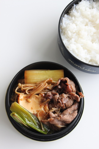 材料は牛肉、ねぎ、焼き豆腐とえのき。春菊は手に入らず、糸こんにゃくはご飯に入っているので省略。それでもお弁当になっていると満足できるものですね〜。彼も満足してくれたようです。よかった。