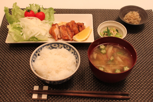 小松菜、えのきのポン酢和え(えのきと小松菜をゆでて食べやすい大きさに切ってポン酢で和えました)、京都で買ってきた下鴨茶寮のちりめん山椒、たまねぎ、みょうが、オクラのお味噌汁と低カロご飯で完成です♪