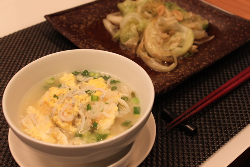 だし汁にご飯、カニ缶、たっぷりのしらす干しを入れて、沸騰したら溶き卵を入れ、小ねぎを散らしました。かにとしらすの風味が美味しい雑炊になりました。