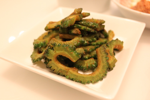 薄切りにしてごま油で炒めたゴーヤに塩胡椒、カレーパウダー、鶏がらスープで味付けして、最後におしょうゆをちょっとたらしました。
