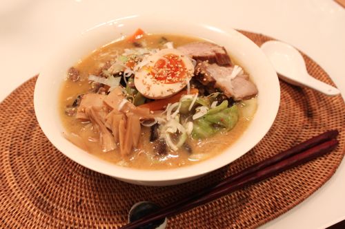 もやし、きくらげ、きゃべつ、にんじん、たまねぎなど野菜がたっぷり入った野菜炒めをスープで煮るのが北海道流だそうですよ。自家製チャーシューと自家製味玉、ねぎと付属のメンマをそえれば立派な味噌ラーメンです。