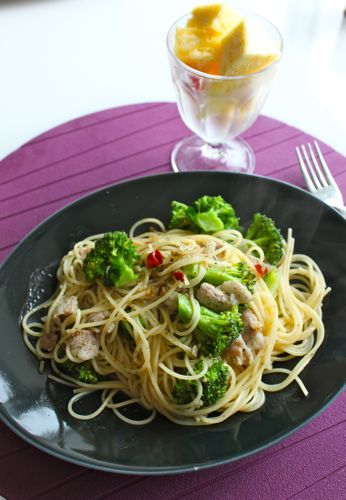 残っていた豚肉小間切れとブロッコリーを使ってアーリオオーリオで仕上げました。