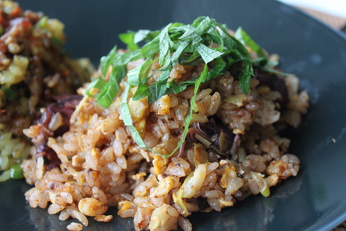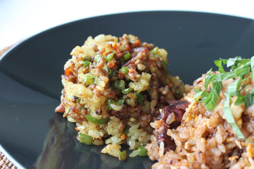 グレープシードオイルでにんにくのみじんぎりを炒め、豚ひき肉、ピーマン、にんじん、たまねぎのみじんぎりを加えてよく炒め、塩こしょうとカレーパウダーで味付けする。ごはんを加えてよくまぜながら炒めてできあがり♪