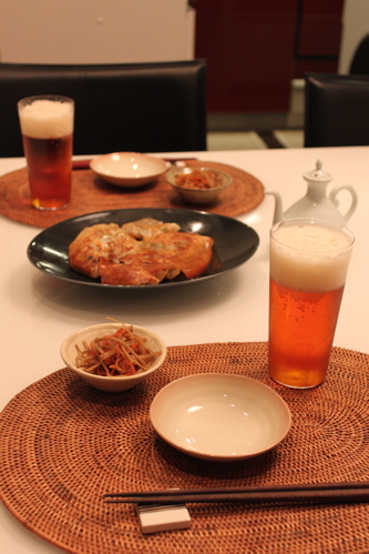 お弁当用に作り置きしていたきんぴらごぼうをおつまみに、メインは冷凍庫で眠っていたキムチ餃子です。