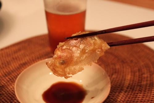 パリパリの羽根つき餃子はビールに合いますね〜。うーん、おいしい♪