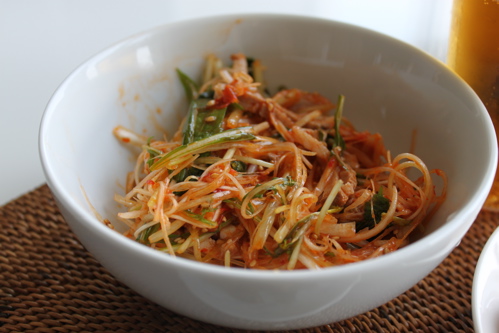 チャーシュー、白髪ねぎ、水菜を豆板醤ベースで合えてあります。