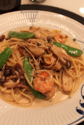冷蔵庫にはたくさんのキノコ(エリンギ、しめじ、えのき、ポルチーニ)があって、他に少し残った海老もあったので合わせてみました。スナップエンドウは彩りに。