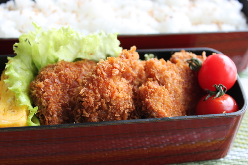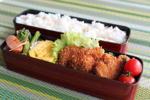 小さなお弁当箱作戦を続けるつもりでいましたが、この日はおにぎりをにぎる時間がなかったのと揚げたヒレかつの量を考えて、いつものお弁当箱を使いました。