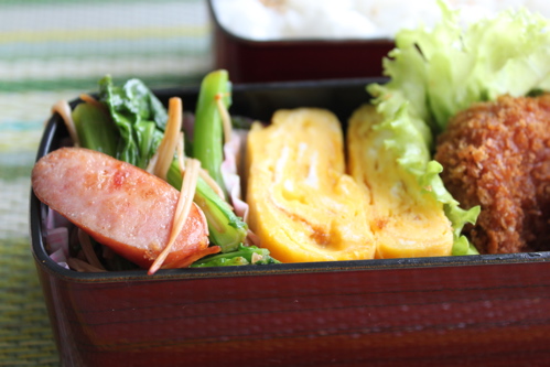 ヒレかつでお弁当箱の半分を占めたので、他には卵焼きと野菜(レタス、ミニトマト)、そしてOisixで買ったかぶれ菜という福島の伝統野菜を使った炒め物をいれました。