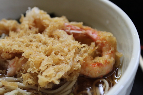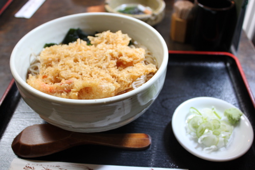 この日は20度をこえる暑い日で、陽にあたっていたせいもあって暑いくらいでした。そこで私がオーダーしたのは「冷しおろし天そば」です。冷たい天ぷらそばに大根おろしが入っているもの。暑い日にはぴったりですよね。