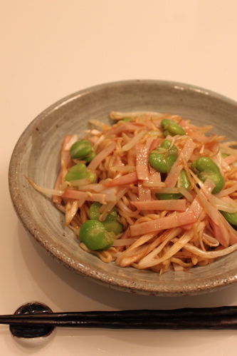 レシピにはないですが、蚕豆ともやしもいれてボリュームたっぷり。