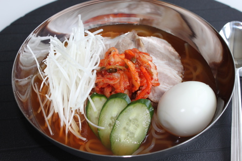 盛岡冷麺は麺が白くて、韓国のものより太めでした。