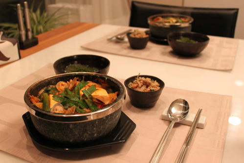 石鍋にあさり、ねぎ、えのき、にんじん、豆腐、合わせ調味料(コチュジャン、韓国唐辛子、ごま油、酒)、白菜キムチを順にのせ、お水を加えて火にかけます。グツグツ煮立ってきたら味を整え、あさり3つとニラをのせてあさりの殻があいたらできあがり♪(最後のあさりは見た目を考慮して最後に3つだけ上にのせました)