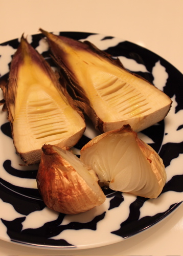 オリーブオイルとおいしいお塩(私はフランスの岩塩を使用)でシンプルにいただきます。たまねぎはとろっとろでとっても甘かったです。たけのこは特に穂先の方がやわらかくておいしかったのですが、下の方はちょっとえぐみが強くて、私はあとで胸焼けがしてしまいました。彼はなんともなかったし美味しかったと言っていたので、私に合わなかっただけか食べ過ぎてしまったのかもしれません。焼き方が不十分だったのかなぁ。