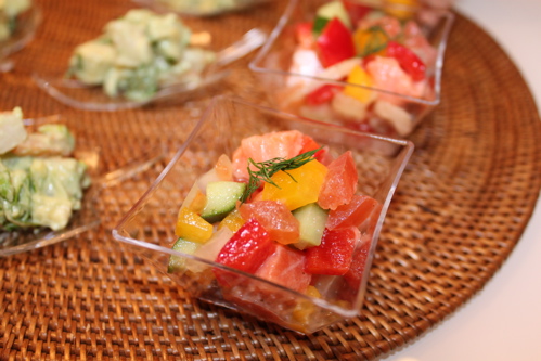 1cm角に切ったサーモン、パプリカ、たまねぎ、きゅうり、トマト、塩こしょう、レモン汁でよく合え、冷蔵庫で冷して最後にディルを飾りました。